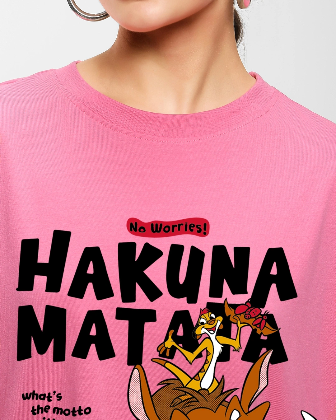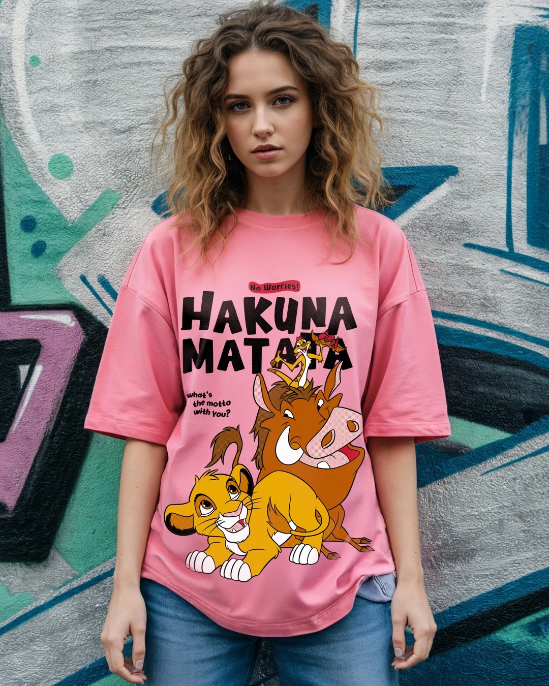 With its super loose oversized fit, this Hakuna Matata women’s t-shirt lets you breathe because style should never feel restrictive! The single jersey fabric made from 100% cotton is light, breezy, and oh-so-comfortable, just like Timon and Pumbaa’s carefree lifestyle. Designed with a round neck and half sleeves, it’s the ultimate casual staple.